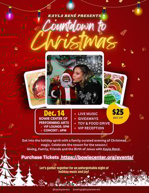 Kayla René Presents: Countdown to Christmas, Bowie Center for the Performing Arts, 15200 Annapolis Rd 5:00pm