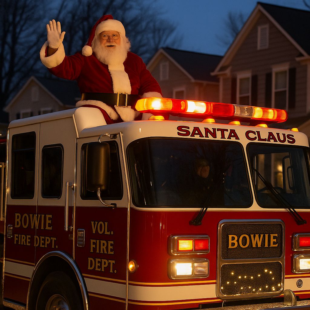 Each holiday season Bowie streets light up with flashing lights and fire engine sirens coming down the street as Bowie families eagerly await one of the city’s most cherished traditions—Santa Claus riding through local neighborhoods on a Bowie Volunteer Fire Department fire truck. Long before Christmas morning arrives, residents can hear the joyful sirens and see the flashing lights signaling Santa’s arrival. Children rush to windows and doorsteps, waving excitedly as Santa and his helpers spread cheer along their route. For many Bowie families, this festive drive-through marks the true start of the season, creating memories that last for years. The tradition brings neighbors together, adds sparkle to quiet winter evenings, and reinforces the spirit of community that makes Bowie special. As the fire truck rolls by, decorated with lights and filled with holiday magic, it reminds everyone—young and old—of the joy, generosity, and wonder that define the Christmas season.