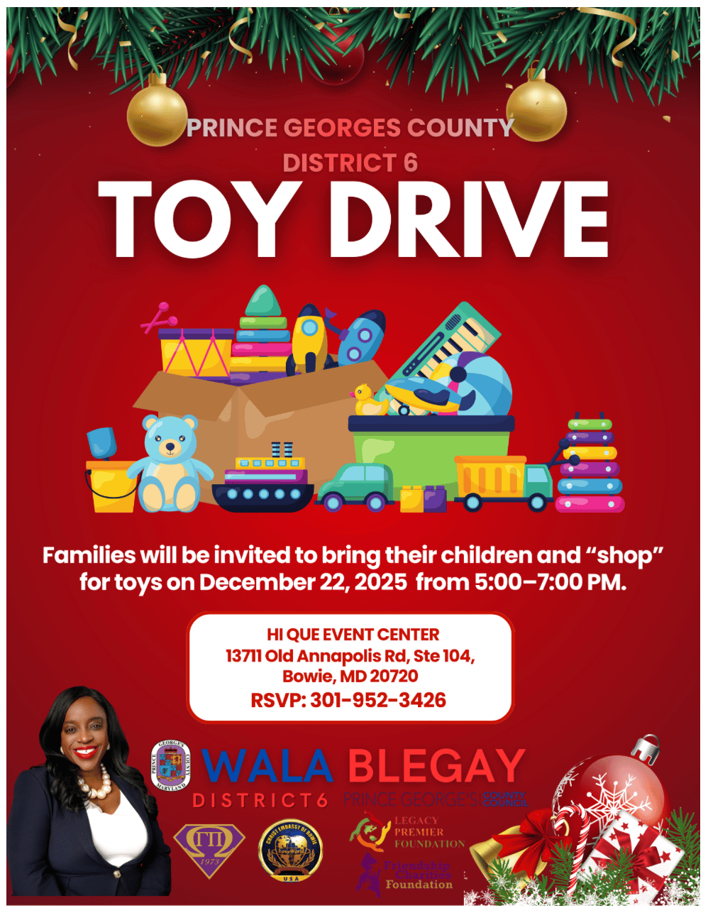 Holiday Toy Drive by Prince George’s County District 6, Hi Que Event Center 13711 Old Annapolis Rd, Ste 104, Bowie 5:00pm - 7:00pm